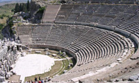 Ephesus, lying ruined on the plains below, was home to over 250 000 people in the 1st century, one of the most populous cities of its time. It contains magnificent temples, the largest known amphitheatre of the ancient world (seating up to 2400) and the library of Celsus. Of the temple of Artemis, one of the Seven wonders of the ancient world, but one solitary column remains, standing alone in a field on the outskirts of Selçuk.